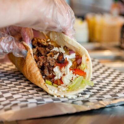 Seasoned beef/chicken/ veg with onions, tomato, and lettuce; wrapped in...